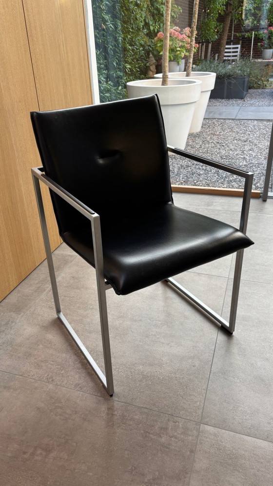 Te koop aangeboden: zes stijlvolle Arco Frame XL stoelen uit 2007. Deze designklassiekers zijn uitgevoerd in hoogwaardig zwart leer en hebben een parelchroom onderstel, wat zorgt voor een tijdloze en elegante uitstraling. Het ontwerp biedt comfortabel zitcomfort, perfect voor zowel woon- als werkruimte.