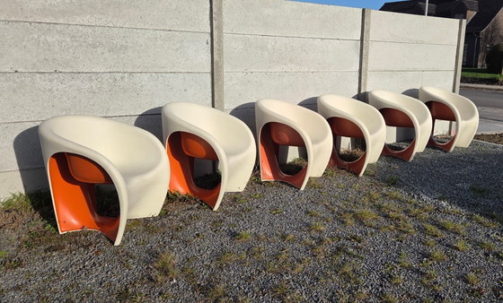Geef je interieur een moderne touch met deze set van 6 Driade MT1 stoelen, ontworpen door de gerenommeerde Ron Arad. Deze stoelen zijn meer dan alleen zitmeubelen; het zijn blikvangers die kunst en functionaliteit combineren. Met hun opvallende crème- en oranje kleurenschema voegen ze een levendige touch toe aan elke ruimte.