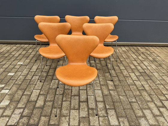 6x Fritz Hansen series 7 Vlinderstoelen Cognac Camel leder