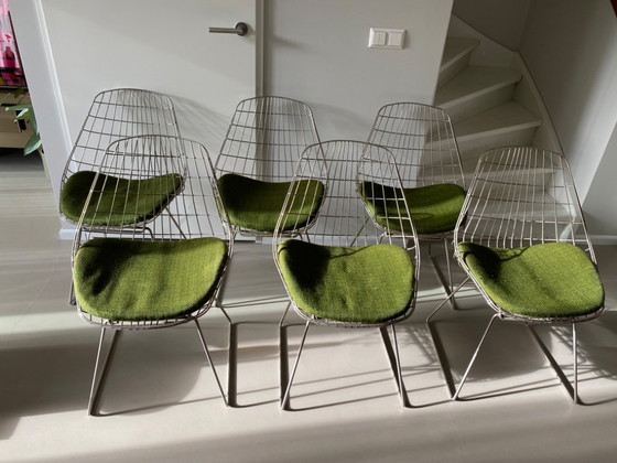 6x klassieke / vintage Pastoe SM05 stoelen met originele zitting van donkergroen stof. De zittingen werken nog prima, vertonen hier en daar slijtage.