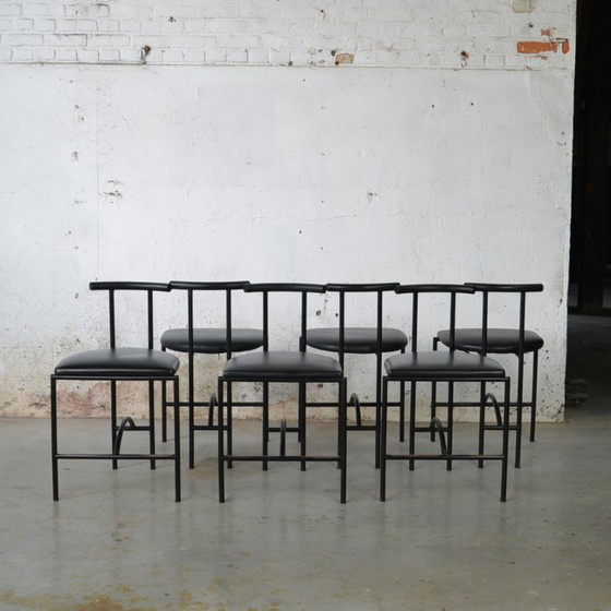 Set van 6 Tokyo stoelen, ontworpen door Rodney Kinsman en geproduceerd door Bieffeplast Padova in de jaren 1980. Deze stoelen combineren een strak metalen frame met comfortabele skai bekleding, perfect voor een moderne eetkamer of kantoorruimte.