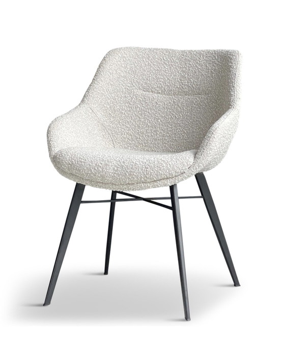 Set van 6 eigentijdse eetkamerstoelen Luca van Zen Lifestyle, bekleed met een trendy en zachte bouclé stof in crème kleur. Evt met dutchbone tafel Clover.