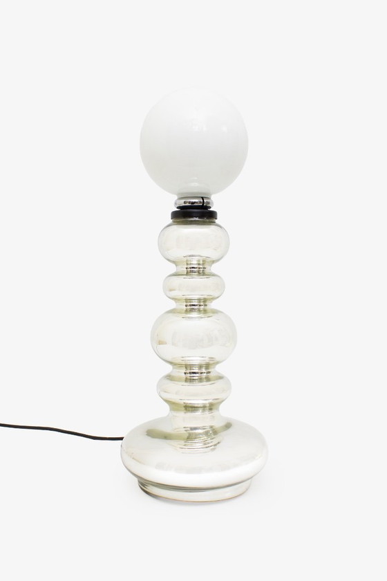 Deze eye-catcher van een vintage tafellamp brengt je helemaal terug naar de Space Age! De lamp is gemaakt rond de jaren 70. De meeste chrome lampen verkleuren in de loop der jaren omdat de lampen worden gemaakt van chrome metaal. Bij deze lamp zit dat net even iets anders, hier zit namelijk een chromen kleurlaag aan de binnenkant van een laag glas. Door het glas wordt de kleurlaag beschermd tegen krassen, waardoor de lamp veel langer in zijn originele staat blijft.