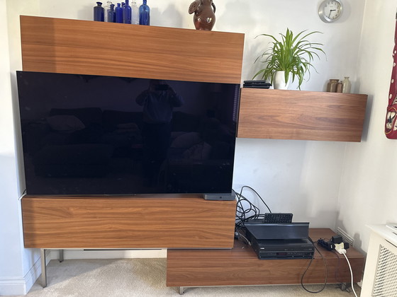 Absoluut prachtig eigentijds Deens wandmeubel/media-element met zes grote opbergladen en bijpassende zwevende plank. Vijf van de kasten zijn walnootfineer en één heeft een zwarte voorkant. De onderste kasten staan op chromen poten en kunnen aan de muur worden aangepast. Andere worden aan de muur bevestigd. Onderdeel van de Bo Concept Veloni serie. In uitstekende staat, met een paar krassen op de bovenkant van een van de onderkasten.
