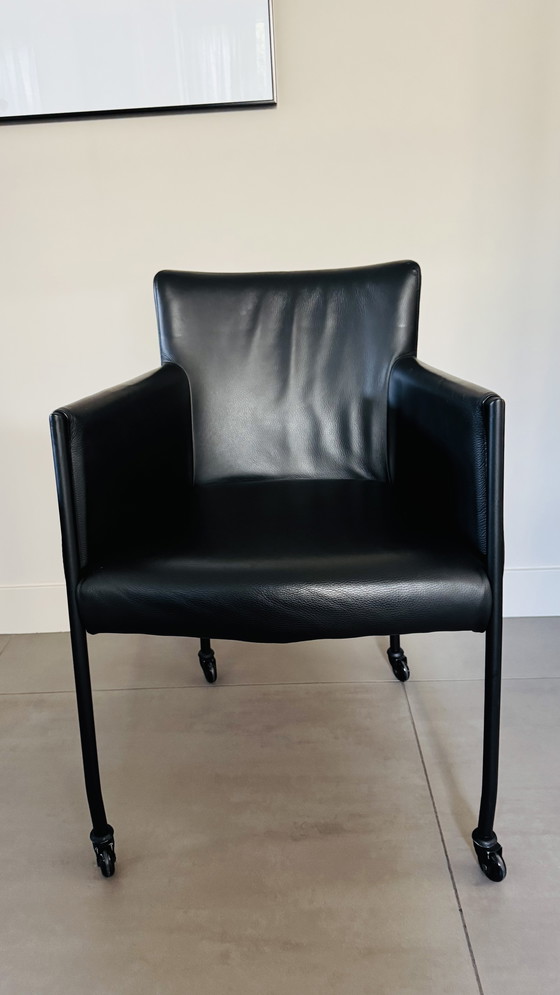 Set van 8 Piet Klerkx eetkamerstoelen met armleuning. De stoelen zijn bekleed met zwart leer en hebben een modern design. Ze zijn voorzien van skater wieltjes voor extra comfort en mobiliteit. De stoelen zijn in zeer goede staat, het leer is onbeschadigd.
