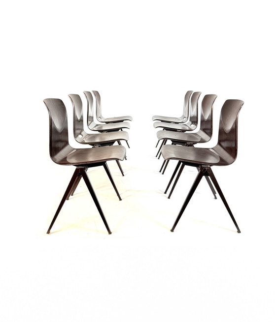 Prachtige set van Nederlandse bodem. Model S22 met een geperste ‘Pagholz’ kuipzitting van hout en hars. Onverwoestbaar en elegant. Een prettige zit met lichte beweging in de rug.