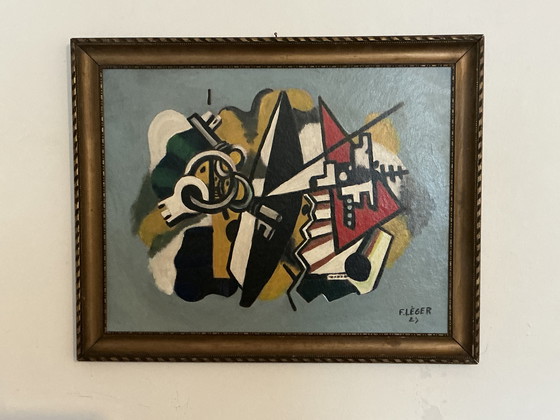 De compositie combineert sterke kleuren, dynamische vormen en strakke lijnen, wat een expressief en evenwichtig visueel effect creëert.