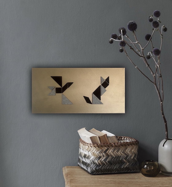 Dit abstracte schilderij is een unieke toevoeging aan elk interieur. Het kunstwerk heeft een koperkleurige achtergrond en is gemaakt op een premium linnen doek van 30x60 cm. De abstracte applicatie is vervaardigd uit natuurrubber en pure wol, wat het een ecologisch verantwoord kunstwerk maakt. De materialen zijn zorgvuldig geselecteerd en persoonlijk opgehaald uit de Algarve, Portugal. Dit stuk is perfect voor liefhebbers van moderne en duurzame kunst.
