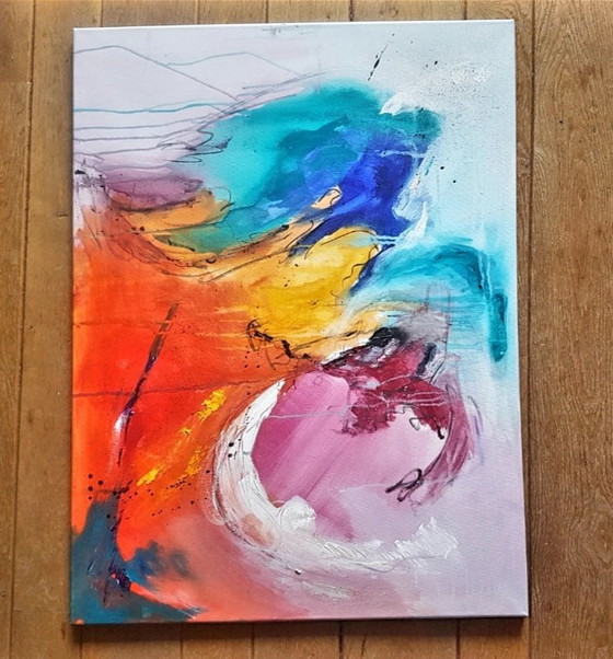 Dit abstracte schilderij, getiteld 'Go Inside', is een levendig kunstwerk dat een explosie van kleuren en bewegingen toont. De combinatie van blauw, oranje, roze, rood, wit en geel creëert een dynamische en boeiende compositie. Het schilderij is gemaakt op canvas en straalt een moderne en eigentijdse stijl uit. Perfect voor het toevoegen van een vleugje creativiteit en kleur aan elke ruimte.Word geleverd incl certificaat van echtheid indien wenselijk !
