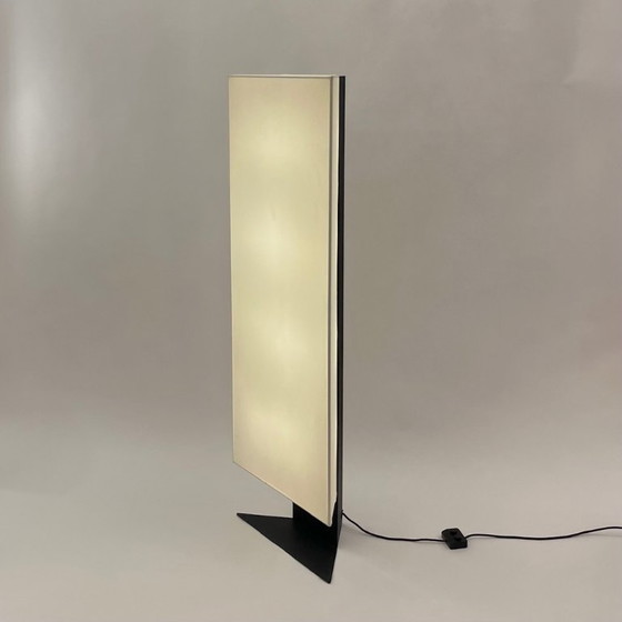 Schitterende Accademia vloerlamp van Cini Boeri, geproduceerd door Artemide rond 1978. Gebroken witte stof gespannen over een metalen frame, dat zelf weer bevestigd is aan een zwarte metalen structuur die rust op een driehoekige voet.