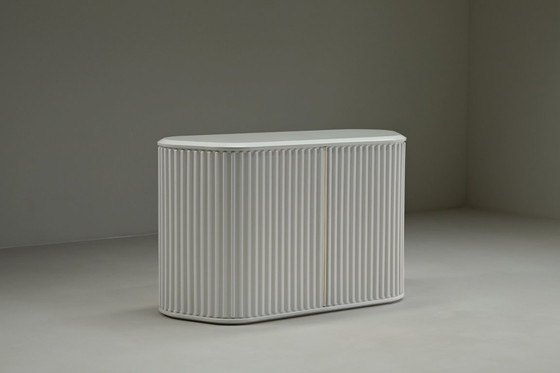 Dressoir A’dammer van Aldo van den Nieuwelaar voor Pastoe, jaren 70, Nederland. De A’dammer is een icoon van Nederlands design. De naam verwijst naar de karakteristieke paaltjes die je overal in Amsterdam ziet. Gekarakteriseerd door de geribbelde roldeuren en de minimalistische, afgeronde vorm, combineert de A’dammer functionaliteit met tijdloze elegantie. De roldeuren schuiven soepel open en bieden toegang tot ruime opbergruimte, waardoor het dressoir zowel praktisch als sculpturaal is. Een ware designklassieker die eenvoud, precisie en ingetogen verfijning belichaamt. In goede vintage staat met gebruikssporen die passen bij de leeftijd.