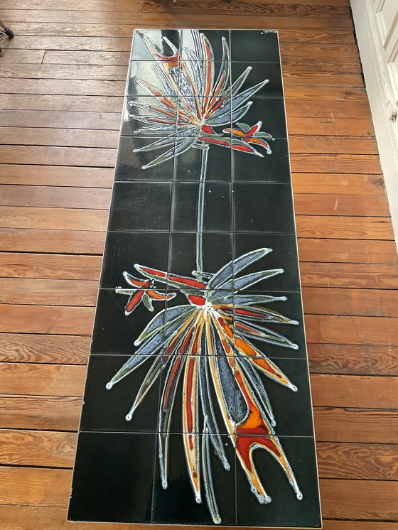 Salontafel van keramiek, gesigneerd ADRI, groot model ten voeten uit met bloemmotief op een middernachtblauwe achtergrond. Gedateerd in de jaren 60/70. Kleine chips op de hoeken en barsten in de tegels en handtekening, maar nog steeds leesbaar. Aluminium en teakhouten poten in zeer goede staat. Zeer goede algemene staat. Afmetingen: Bovenkant: 139 cm X 47 cm. Hoogte: 42 cm.