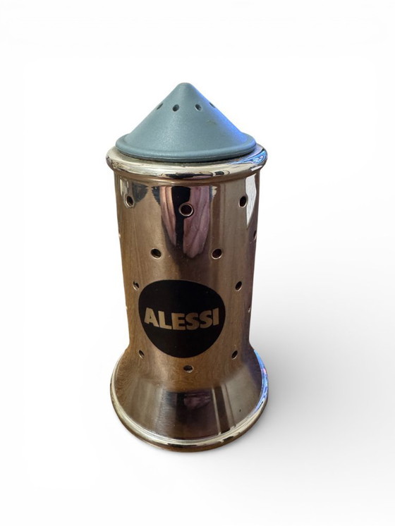 Originele Alessi MGSAL zoutstrooier uit de jaren 80. Ontworpen door Michael Graves voor Alessi. Zoutstrooier van spiegelgepolijst 18/10 roestvrij staal met zwarte PA-stop en deksel. Hoogte 11,30 cm, diameter 6,30 cm. Gemaakt in Italië.