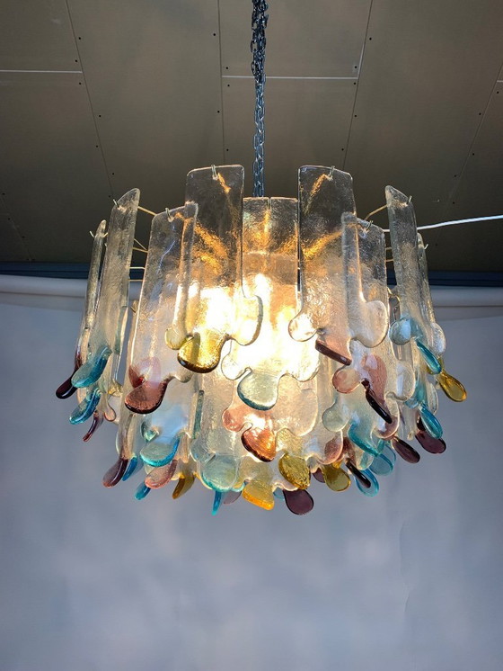 Verlicht je ruimte met de prachtige charme van deze Alfredo Barbini-kroonluchter uit de jaren 1970. Dit prachtige stuk, gemaakt van het fijnste Murano-glas, heeft een prachtige reeks kleuren die dansen met het licht en een betoverende sfeer creëren.