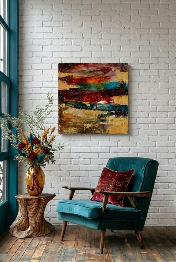 Een krachtig werk als "Gold" past perfect in een industriële chique omgeving en creëert een verfijnde dialoog tussen hedendaagse kunst en interieurontwerp. Het speelt met het contrast van kleuren en materialen, vult de ruimte fysiek, chromatisch en materieel en verbindt alle meubels met elkaar.