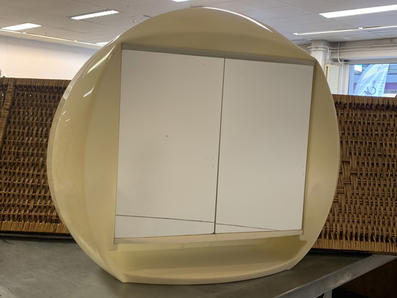Allibert badkamerkastje. Gaaf rond opberg kastje met verlichting en stopcontact aan de binnenzijde voor het scheerapparaat. Gemaakt in 1970 ontworpen door Pierre Paulin, Frankrijk. De electra in het kastje moet nog aan een stekker vastgemaakt worden waarna er 3 zijden verlicht kunnen worden.