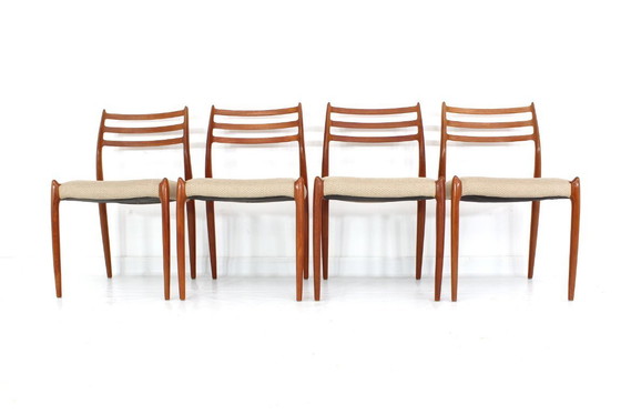 Te koop: een set van vier zo goed als nieuwe, originele Niels O. Møller Model 78 Deense eetkamerstoelen van teakhout met nieuwe bekleding.