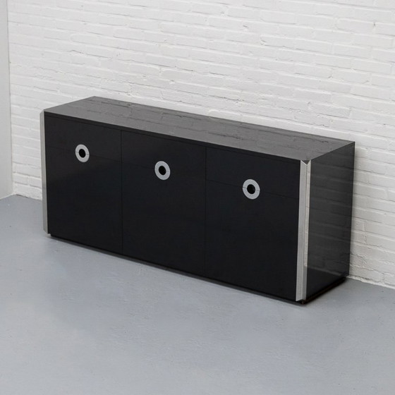 “Alveo” dressoir ontworpen door Willy Rizzo en geproduceerd door Mario Sabot, Italië, jaren 70. Het ontwerp speelt met sterke contrasten: diep zwart gelakt hout gecombineerd met glanzende chromen hoekstukken en ronde metalen grepen die het front een krachtig grafisch ritme geven.