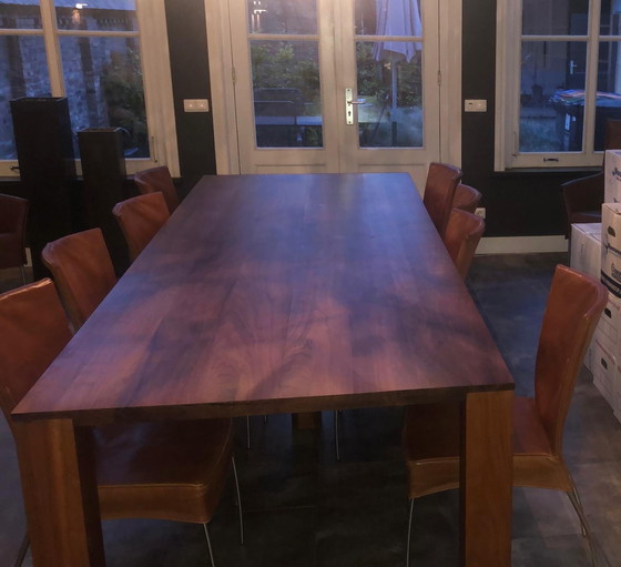 Deze prachtige Amerikaanse notenhouten tafel is een indrukwekkend meubelstuk van 3 meter bij 1 meter. Het is vakkundig door een meubelmaker in de lengte doorgezaagd, waardoor het demontabel is. De set wordt compleet geleverd met 8 bruine leren Spica stoelen van het merk Montis, die een moderne uitstraling hebben. De stoelen zijn comfortabel en stijlvol, perfect voor lange diners. De tafel en stoelen zijn in goede staat, met slechts enkele gebruikssporen die de charme van het geheel niet verminderen.