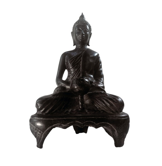 Prachtige antieke Amitabha meditatie Boeddha - Thailand 16e eeuw - H 24 cm - B 15 cm - D 10 cm - Zeer goede staat, prachtig patina - Een vredig gezicht met introspectieve neergeslagen ogen, een stevig voorhoofd, hij straalt harmonie uit. Amitabha Boeddha's handen worden vastgehouden in de Dhyana mudra, een meditatiehouding. De vingers raken elkaar nauwelijks en zijn zachtjes over de knieën gevouwen, de handpalmen naar boven gericht. Dit handgebaar stimuleert de energie van meditatie, diepe contemplatie en eenheid met een hogere energie. De Boeddha in meditatie, ook bekend als Dhyana Mudra of Samadhi Mudra, is een emblematische voorstelling van de Boeddha in een contemplatieve, meditatieve houding. Zoals de traditie het voorschrijft, wordt de Boeddha in meditatie hier zittend afgebeeld, met beide benen gekruist in een halve lotushouding. De handen zijn in Dhyana Mudra geplaatst, de rechterhand rust op de linker, de duimen raken elkaar zachtjes aan en vormen een subtiele driehoek of cirkel. De rug van de Boeddha is recht en zijn blik is naar beneden gericht, wat diepe concentratie en innerlijke reflectie betekent. In zijn handen houdt hij een aalmoesschaal, waarmee hij de liefdadigheid en vrijgevigheid van de Boeddha laat zien. Het lichaam wordt bedekt door een Sanghati gewaad dat diagonaal over de linkerschouder wordt gedragen en versierd is met een zwaar geplooide flap die tot aan de navel wordt gedrapeerd. De rechterschouder is ontbloot. Dit beeld is van diepgaande betekenis in de boeddhistische traditie, het brengt essentiële leringen over en belichaamt de deugden van innerlijke rust, mindfulness en spirituele reflectie.