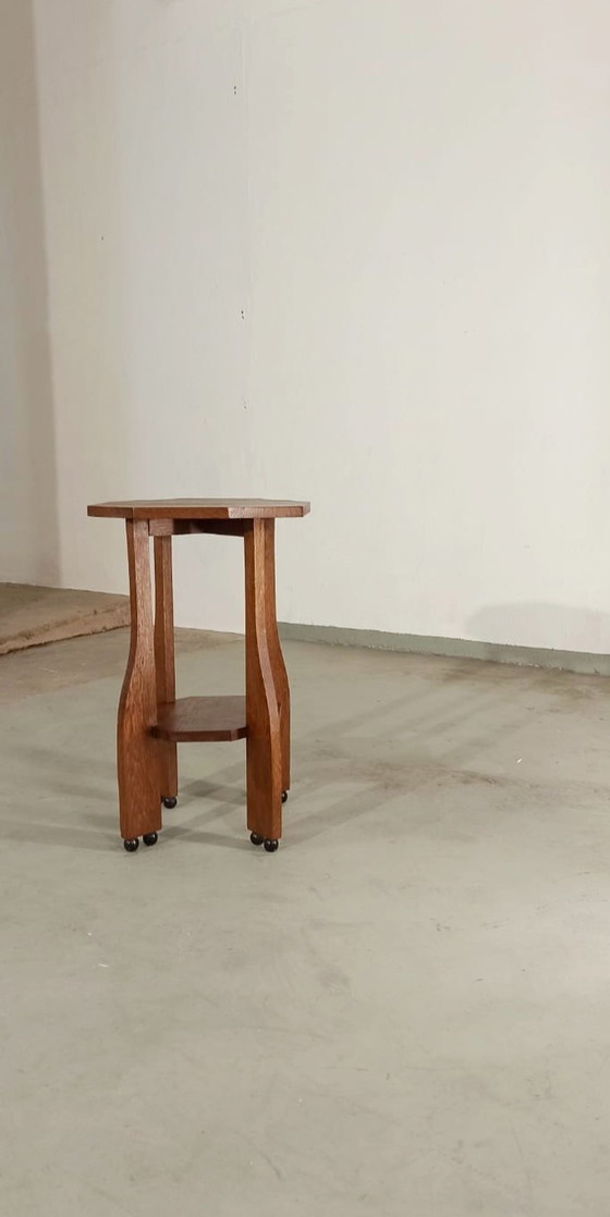 Vintage Art Deco Amsterdamse school eikenhouten bijzettafel. Enkele reparaties/gelijmde delen, zie foto's. Hoogte 64,5 cm Breedte 40 cm Diepte 40 cm