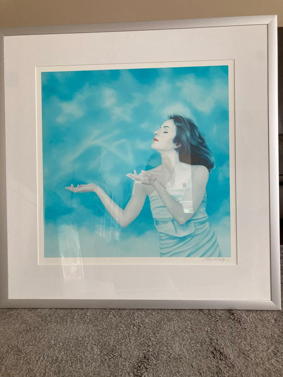 Dit is een prachtig ingelijste en gesigneerde kunstwerk van Ans Markus. Het kunstwerk is voorzien van een passe-partout en is ingelijst in een strakke, moderne lijst. De afbeelding toont een vrouw in een serene pose tegen een blauwe achtergrond, wat een gevoel van rust en elegantie uitstraalt. Het werk is een mooie toevoeging aan elk interieur en is klaar om opgehangen te worden.