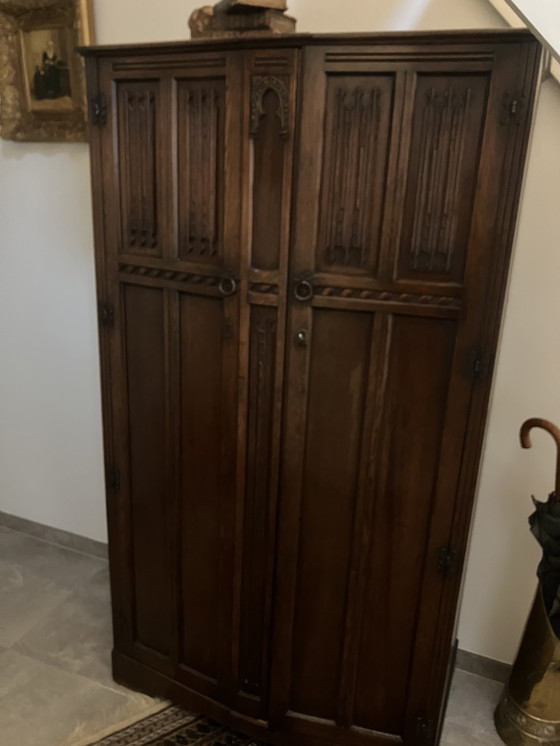 Ga terug in de tijd met deze prachtige antieke kledingkast, een perfecte combinatie van functionaliteit en vintage charme. Het rijke bruine hout en de verfijnde houtsnijwerken maken het een betoverende aanwinst voor elke kamer, met zowel opbergruimte als stijl.