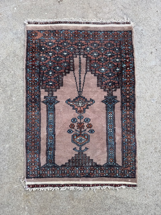 Handgeweven Afghaanse wollen gebedskleed met een mihrab (gebedsnis)-motief in een donker palet (bordeauxrood, bruin, middernachtblauw en turquoise) uit de jaren 50/60; goede algehele staat (enkele tekenen van slijtage en ouderdom).