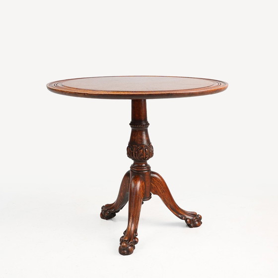 Antiek Engels handgesneden rond eiken bijzettafeltje met leeuwenkopvoeten