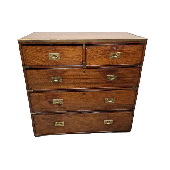 Antiek Engels mahonie Campaign ladekast, afkomstig uit circa 1820/30. Prachtige Engelse mahonie ladekast bestaande uit 2 delen en in totaal 5 laden en messing grepen, de binnenkant van de laden zijn bekleed met blauw papier. Rondom afgewerkt met messing om de hoeken te beschermen tijdens transport. Dit soort meubels werden gemaakt om makkelijk te kunnen vervoeren bijvoorbeeld voor het leger. Hij is groten deels gemaakt van massief mahonie alleen de binnenkant van de laden, achterkant en binnenwerk is van vuren. Aan de achterkant 2 Engelse etiketten waarvan 1 uit Winchester tevens zijn aan de onderkant van de laden woorden en letters in gesneden. Hij kan wat liefde gebruiken maar nog steeds in een stevige conditie.