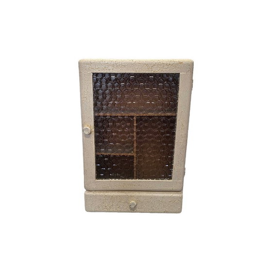 Antiek Frans medicijn wandkastje, afkomstig uit begin 1900. Leuke brocante crème geschilderde medicijn wandkastje met lade en prachtige glasplaat in de deur. De verf heeft in de loop der jaren craquele gekregen wat een geweldige uitstraling geeft.
