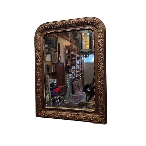 Antiek Franse Art Nouveau spiegel, afkomstig uit het begin van 1900. Prachtige spiegel met een goudkleurige lijst met typische Art Nouveau elementen. Gemaakt van hout met gips in reliëf, de spiegel heeft helaas een klein stukje missend rechts bovenin.