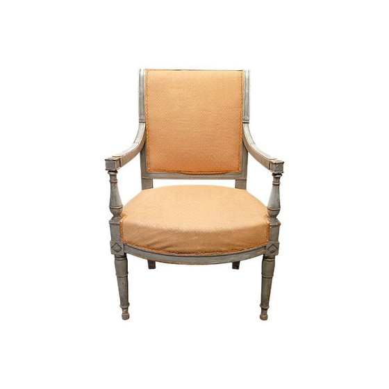 Antiek Franse Louis XVI armstoel, afkomstig uit circa 1780. Prachtige antiek Franse stoel uit de Louis XVI periode met typische stijl elementen. Vermoedelijk in de jaren is de bekleding vervangen voor een klassiek oranje stoffering. Het frame is volledig gepend en heeft een verweerde grijze beschildering. Rondom een paar oude restauraties verder in een stevige conditie.