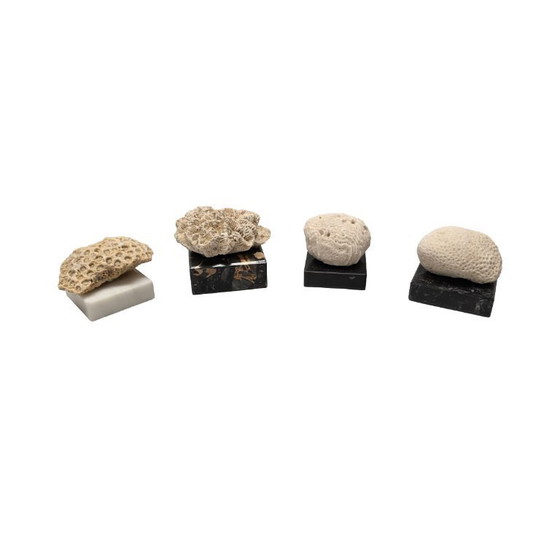 Antiek koraal op marmeren voetjes, afkomstig uit het begin van de 20e eeuw. Set van 4 diverse stukjes koraal gelijmd op verschillende kleuren marmer. Door de vorige eigenaar op de blokjes marmer gelijmd.