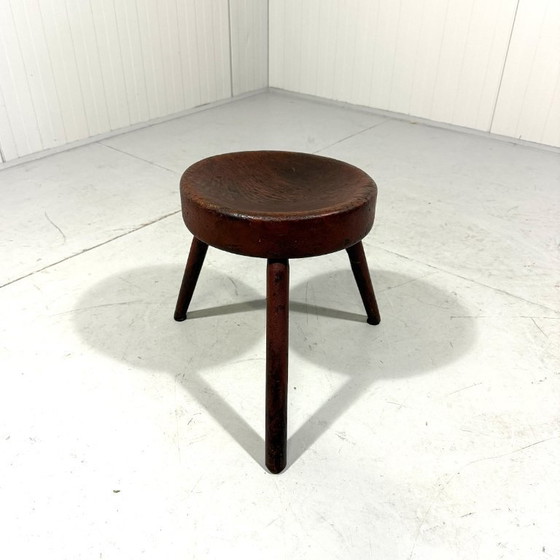 Erg mooi gevormde ronde zitting gemaakt uit één stuk hout, drie poten, mooi patina.