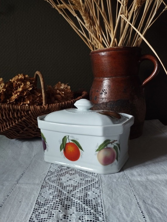 Witte porseleinen terrine voor paté of foie gras. Achthoekig van vorm, gestempeld met "echt ovenbestendig porselein", "gemaakt in Frankrijk" en gedecoreerd met diverse vruchten (pruimen, peren, clementines, enz.).