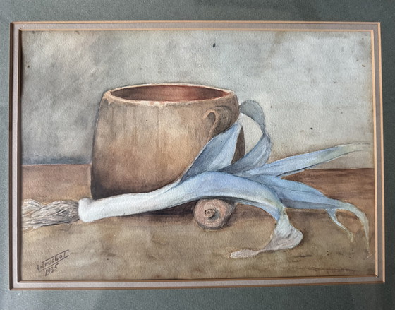 Een charmante en prachtig uitgevoerde aquarel van een stilleven met prei in zachte, warme kleuren, gesigneerd door A. Truchot en gedateerd 1934; elegant en professioneel ingelijst; in zeer goede algehele staat (enkele vlekjes op de lijst).