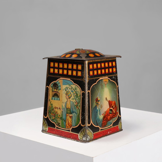 België / 1900 / Doos / De Beuckelaer / Tin / Art Nouveau / Art Deco Een prachtig versierd blikken koekdoosje van De Beuckerlaer, gemaakt in België rond 1900. Versierd met vier verschillende scènes uit de Arabische Nachten en de Lamp van Aladdin. Aan de onderkant gemerkt: Koekjes, De Beukelaer, Antwerpen. Het kunstwerk heeft levendige kleuren en delicate details, waardoor het een ideaal cadeau is of een prachtige aanvulling op je eigen collectie.