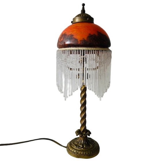 Antieke Art nouveau kralenlamp van gepolijst oranje paars glas met kralenrand uit de jaren 20/30. Deze art nouveau tafellamp heeft een prachtig bewerkte messing voet met veel details.