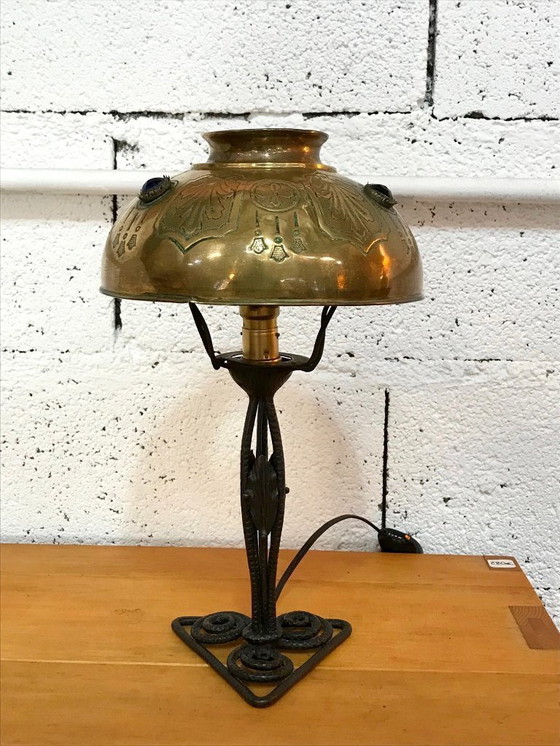 Art Nouveau lamp in goede staat. Stalen voet, koperen kap, B22 bajonetfitting, gloeilamp meegeleverd. Een paar sporen van tijd en gebruik op de lampenkap zichtbaar op de foto's.
