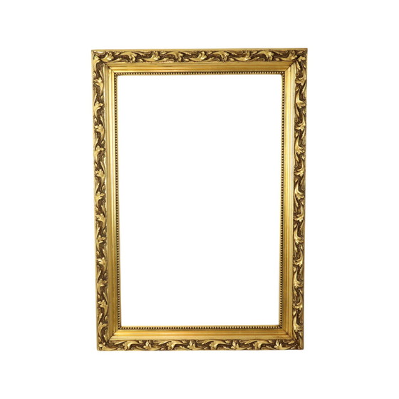 Prachtige grote antieke barok stijl lijst gemaakt uit grenenhout en gesso acanthus decoratie in reliëf, het geheel is met bladgoud verguld, de lijst is een mooi voorbeeld van hoe elegant en sierlijk een schilderijlijst wel kan zijn, vermoedelijk Belgisch, eerste helft van de 20ste eeuw.