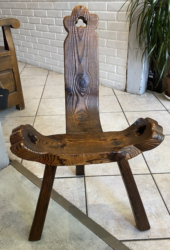 antieke brutalistische driepootstoel nr. 1, gesneden uit massief hout