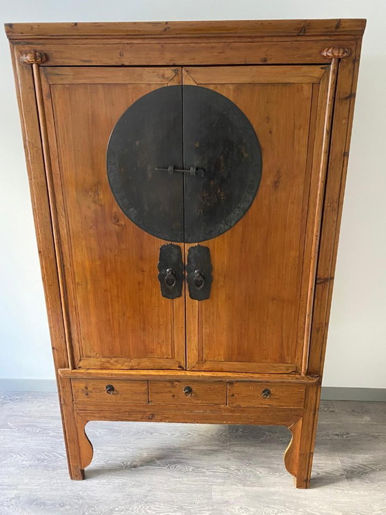 Voeg een vleugje geschiedenis toe aan je interieur met deze antieke Chinese bruidskast. Het warme bruine hout en de opvallende metalen details maken het een echte blikvanger. Perfect voor het opbergen van kleding of decoratieve items, deze kast combineert functionaliteit met een uniek vintage ontwerp.