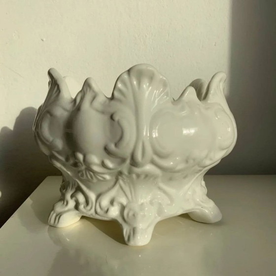 Constructie: De vaas staat op zes sierlijke poten die naadloos overgaan in de romp van de cachepot. De bovenrand is onregelmatig en volgt de golvende lijnen van het sculpturale decor.