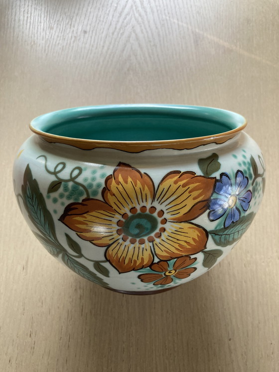 Antieke Gouds plateel bloem/ sierpot in perfecte staat en in prachtige kleurencombinatie