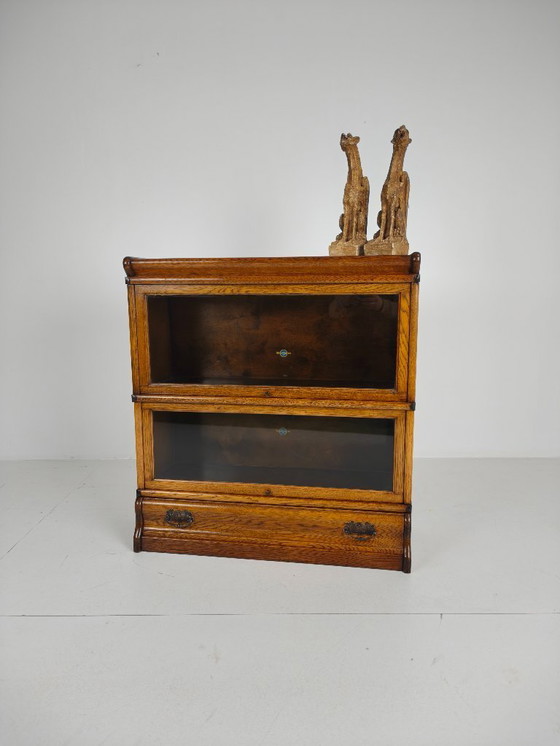 Prachtige en originele Globe-Wernicke houten boekenkast, daterend van circa 1910–1920 en vervaardigd in Engeland. Deze modulaire boekenkast is voorzien van de originele Globe-Wernicke stempel, een verfijnd tafelblad met lederen inleg en een lade aan de onderzijde met elegante messing handgrepen. Het meubel verkeert in uitstekende en goed bewaarde staat, en toont het klassieke vakmanschap en de tijdloze uitstraling waarvoor Globe-Wernicke bekendstaat.