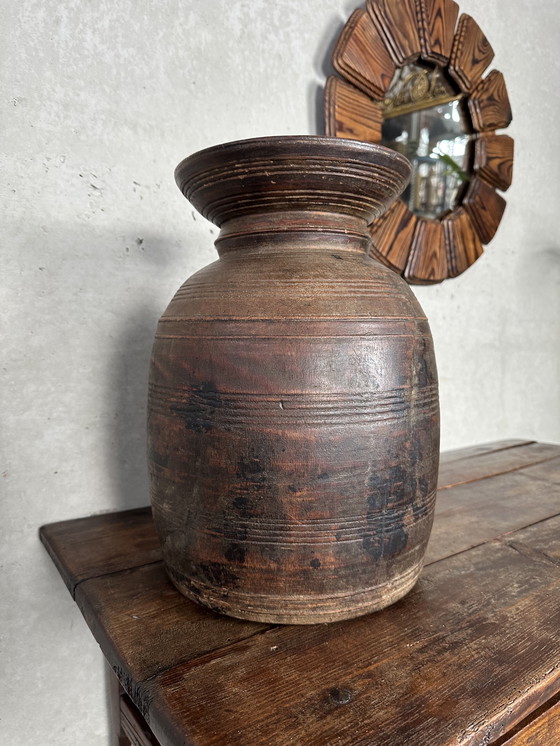 Handgemaakte houten kruik met een wijd uitlopende opening.