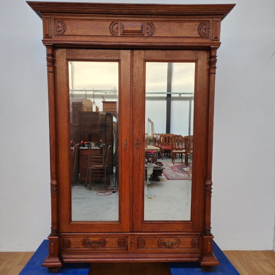 Vintage kledingkast. Deze landelijke hangkast met spiegel heeft twee deuren met werkend slot met daarachter een roede. Onder de deuren zitten ook nog twee lades. Een geweldige kast waar je lekker veel in kwijt kunt. De kast heeft prachtig houtsnijwerk. De deuren hebben een prachtige facet geslepen spiegel. Door zijn leeftijd kunnen de spiegels wat verweerde plekjes hebben. De kast is zeer makkelijk te demonteren en weer in elkaar te zetten. De kast heeft wat kleine gebruikssporen, passend bij zijn leeftijd.