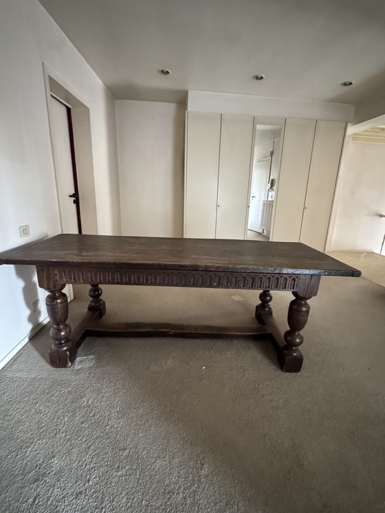 Stel je voor dat je een stukje geschiedenis in huis haalt met deze prachtige antieke kloostertafel. Het rijke, donkere hout en het robuuste ontwerp maken het tot een opvallend meubelstuk dat de blikvanger kan zijn in elke eetkamer of woonkamer. Perfect voor liefhebbers van de charme en het karakter van vintage meubels; deze tafel is zowel een gespreksonderwerp als een functioneel kunstwerk.