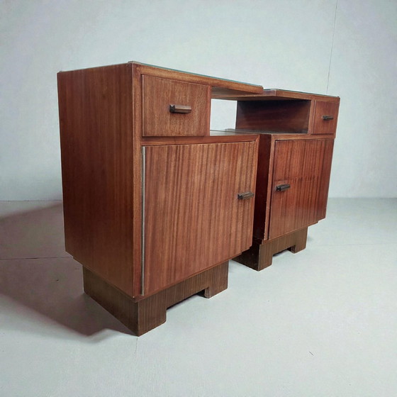 Deze prachtige antieke mahonie set nachtkastjes belichaamt de elegantie van de Art Deco-stijl. Met hun verfijnde lijnen en rijke houttinten voegen ze een vleugje tijdloze charme toe aan elke slaapkamer.